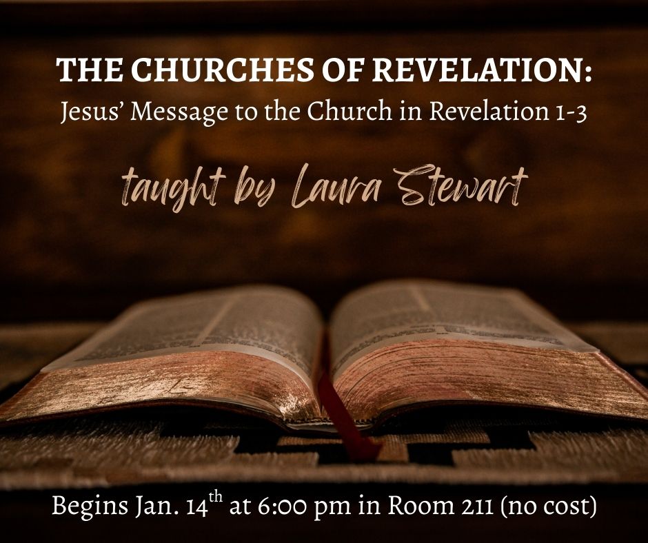 This study on Revelation chapters 1-3 will focus on studying Jesus' message to the 7 churches of Revelation. This class will guide you to become a better student of the Bible as you learn to study it verse by verse. This class will meet in room 211 at 6:00 PM